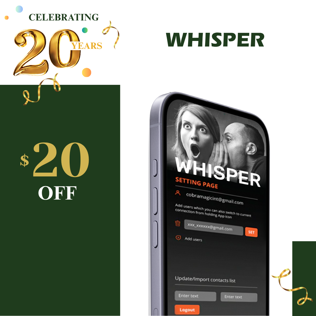 WHISPER allows you to secretly transmit thoughts and ideas to a remote assistant, without any visible action. Your spectators will be amazed that somebody in a distant location can read their minds.